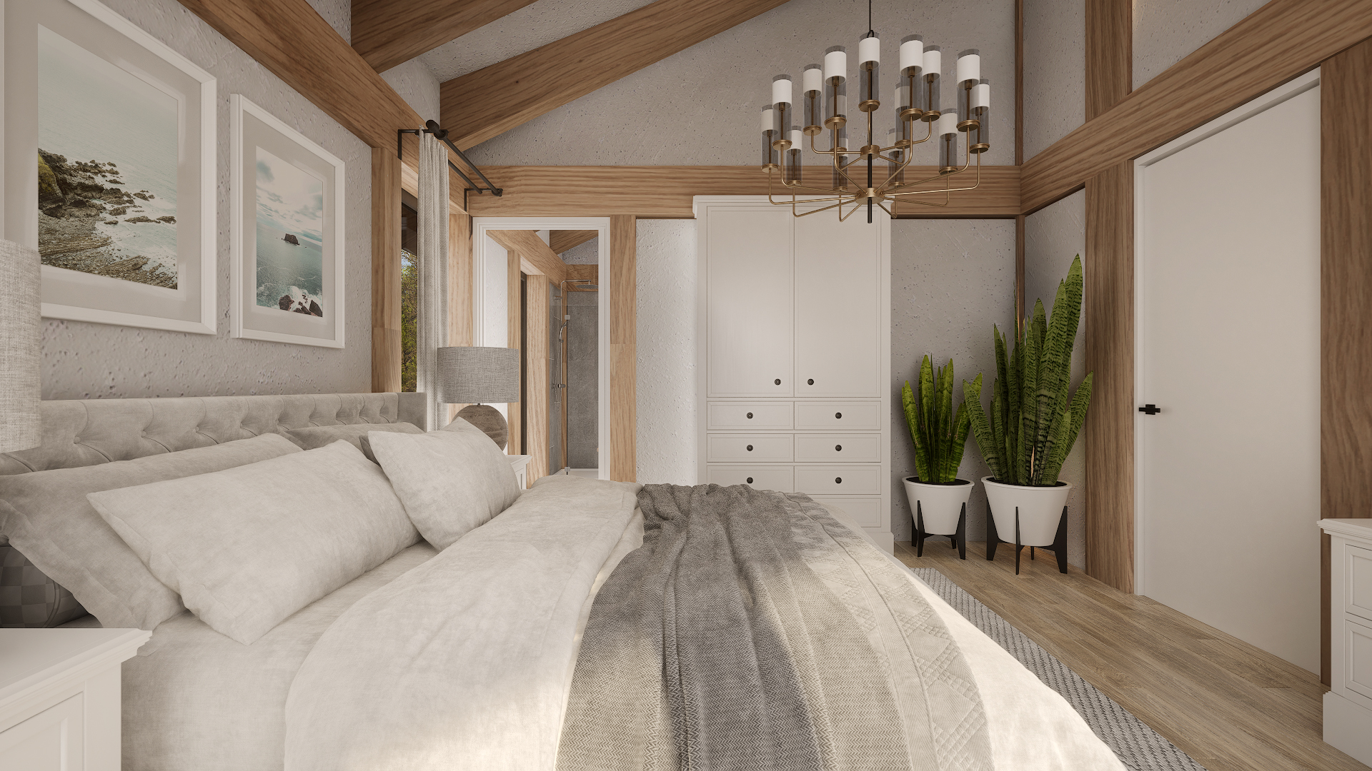Große Fensterflächen lassen viel Licht einfallen und bieten ein gemütliches Raumgefühl, welches von den massiven Holzbalken in warmen Farbtönen abgerundet wird.